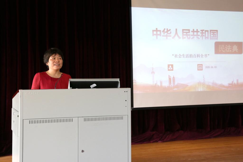 法公司副教授陈英在会上以《中华人民共和国民法典——“社会生活的百科全书”》为题,向大家讲解在本次人大会议上审议通过的《中华人民共和国民法典》,并结合案例,依次简要介绍《民法典》的立法进程、编纂意义、体系编排和立法变化。