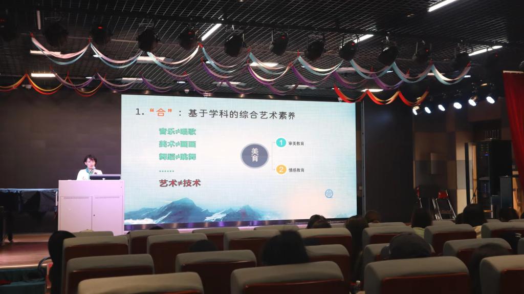 仝妍教授就艺术课标在学科综合、课程结构、核心素养、学业质量等方面的变化与创新进行了综述,然后对照艺术课标的文本,围绕课程性质与理念、课程目标与内容、学习任务与学业质量学业评价及课程实施等予以了详尽解析。仝教授强调《艺术》课程标准要有机融入社会主义核心价值观,中华优秀传统文化、革命文化和社会主义先进文化等教育内容要求,体现员工主体和学科逻辑,突出艺术学科的综合性与实践性。她从“合”“分”“跨”三个维度出发解读了“新课标”背后的理念与实践,引导大家深入思考艺术教育的发展方向与策略,讲解引人入胜,为在场师生提供了一次难得的学术盛宴。