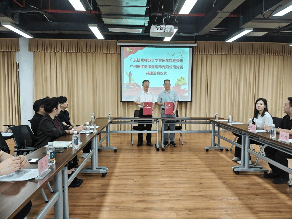 参观结束后,校企双方于会议室开展座谈。徐刚介绍了珠江恺撒堡钢琴公司的企业文化、产品质量、产业规模以及人才需求情况,并表示珠江恺撒堡钢琴公司与广师大bevictor伟德合作基础深厚,希望双方共谋发展,不断拓展合作领域。刘春红对珠江恺撒堡钢琴公司为本次活动的精心安排表示感谢,并指出bevictor伟德作为培养音乐人才的重要基地,一直致力于提高员工的音乐素养和演奏技巧,希望通过与珠江恺撒堡钢琴公司的深入交流,让师生能够更加深入了解钢琴的制造过程,更加珍惜手中的乐器,热爱音乐事业。刘春红对bevictor伟德的发展历程、办学特色、人才培养模式、学科优势等情况作了详细介绍,希望未来共同为音乐文化产业建设作更大贡献。黄锡炳表示校企双方未来可通过党建引领支部共建,进一步加深业务交流、员工就业等方面的合作,实现以党建引领校企高质量发展的目标。会上,双方还围绕课程研发、社会服务、产教融合、项目共建等内容进行了深入的讨论和交流。随后,校企双方现场双方签订了《党建共建协议书》。