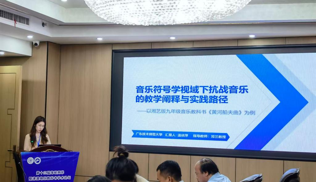 在分论坛“教材内容分析与教学”中,研究生温依萍作了题为《音乐符号学视域下抗战音乐的教学阐释与实践路径——以湘艺版九年级音乐教科书<黄河船夫曲>为例》的学术报告。