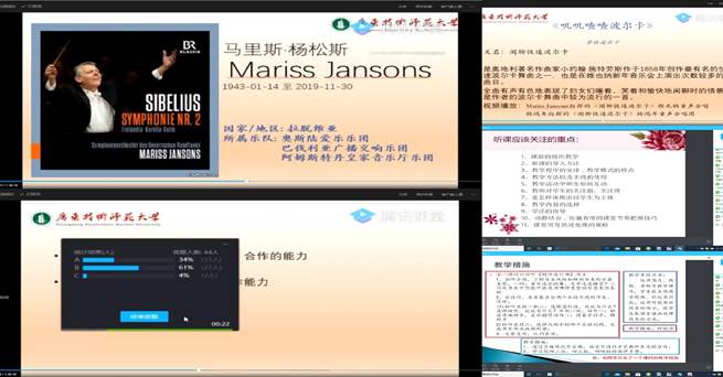 抗疫期间,线上教学是新的挑战,bevictor伟德从教学实际出发,对教师服务的主体对象进行科学精准分类,增强了线上教学的针对性与可操作性。一是要充分考虑学期特殊性,对即将毕业的班级其课程量相对较少,教学工作任务可以考虑春季后线下教学来开展,线上教学平台主要解决研究生、非毕业本科生的教学任务。二是根据课程分类,开展线上教学。教师借助网络科技优势实现全课程在线上开展教学,并针对不同类型课程,教师设计成不同的线上教学方式,如钢琴、器乐、声乐、舞蹈这些技能性较强的课程,课堂互动性、示范性也较为突出,教师通过腾讯课堂结合企业微信的会议和直播功能讲解课程内容的重点、难点、习题讲解、答疑问题、布置作业;理论课教师超星学习通、智慧树、雨课堂等通过PPT线上教师讲解、学习讨论、线上作题、线上答疑等教学手段,为同学们传授课程新知识。目前,bevictor伟德整个线上教学过程平稳,教师精神饱满,员工积极热情,达到了预期的课堂效果。教师开展教学图片: